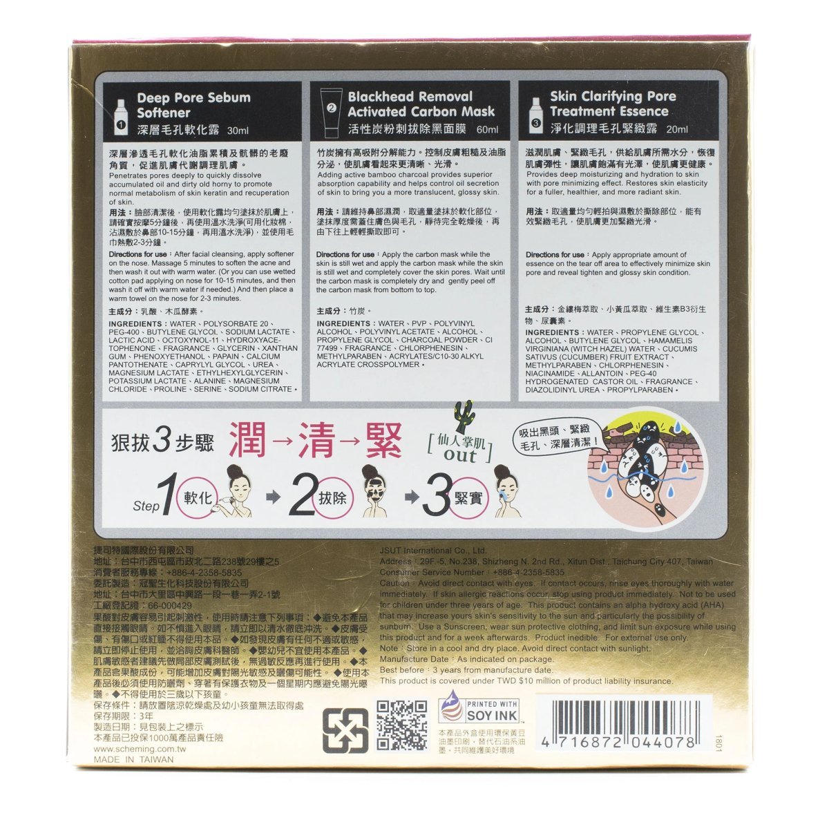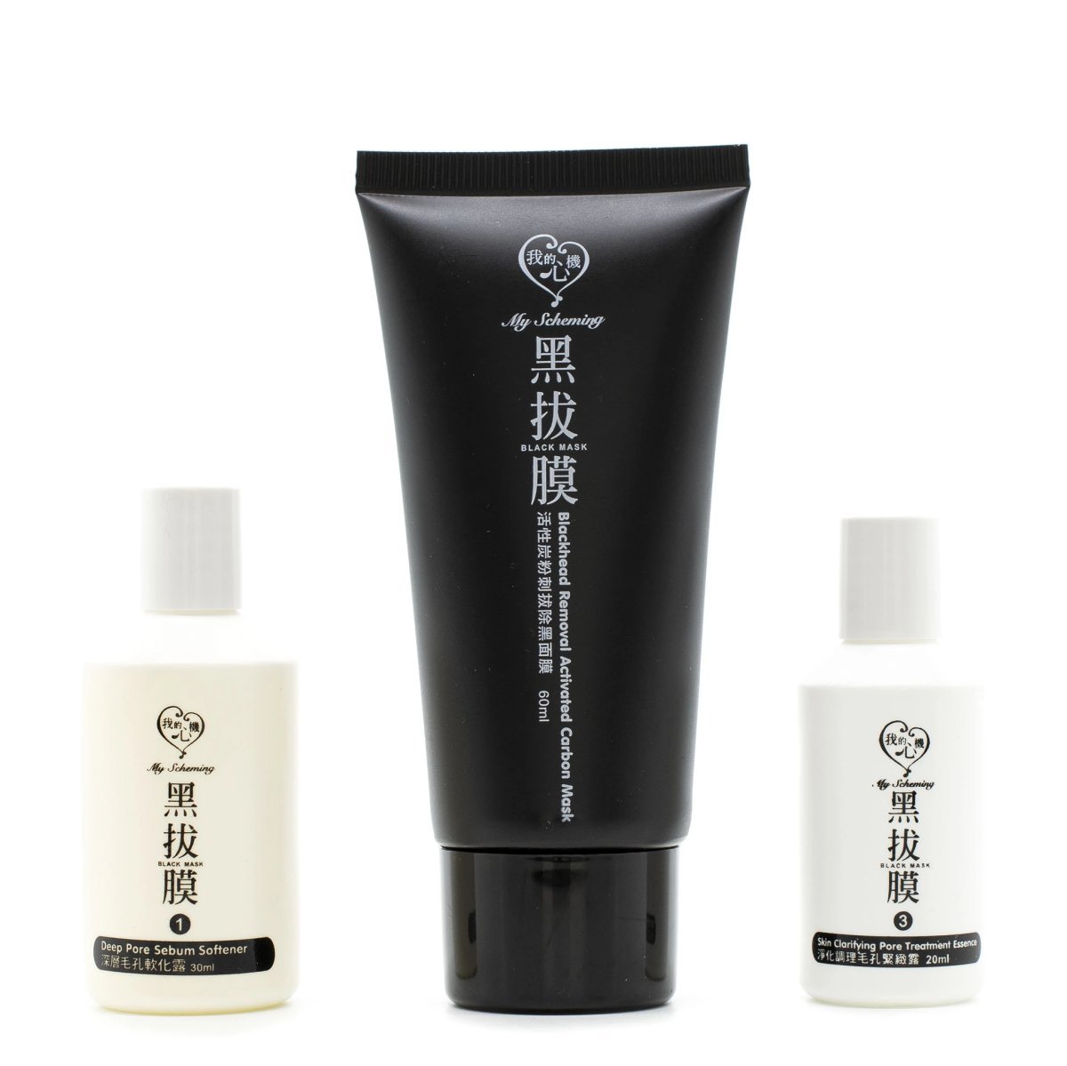 My Scheming Blackhead Removal Activated Carbon Mask Set contains a 3 step treatment kit to remove blackheads from the skin.