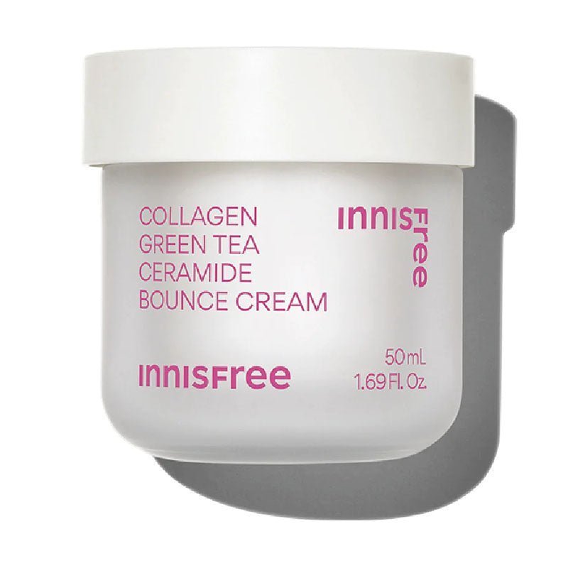 Innisfree Collagen Tea Ceramide Bounce Cream helps boost skin elasticity by providing rich moisture and fortifying skin barrier with Collagen and Green Tea, maintaining a plump and youthful skin look.