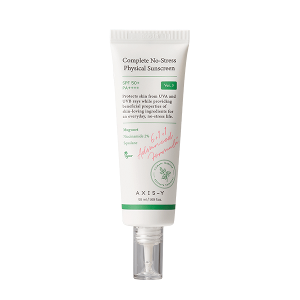Axis-Y Complete No-Stress Physical Sunscreen is a Mugwort based sunscreen featuring 2% Niacinamide and Squalane that protects skin