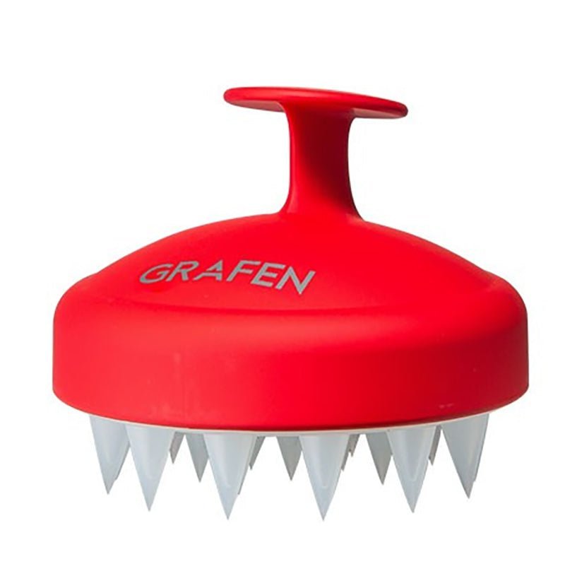 Grafen Edge Finger Shampoo Brush with a grip handle and features soft silicone bristles to massage your scalp.