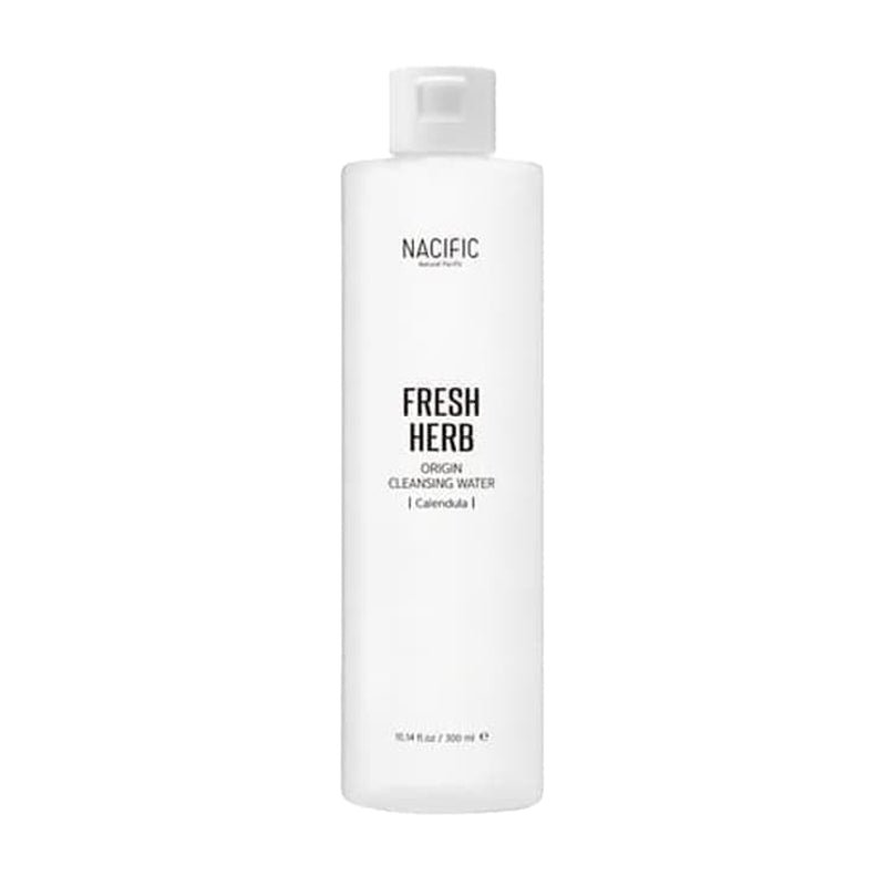 Nacific Fresh Herb Origin Cleansing Water effortlessly removes makeup, cleanses, and tones, which adheres to the cotton pad to lift away impurities while soothing the skin with calendula flower water.