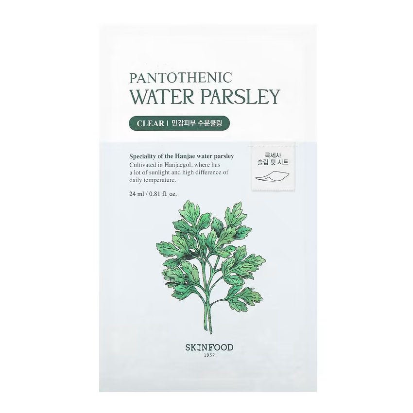 Skinfood Pantothenic Water Parsley Mask is a hypoallergenic cooling moisture mask for sensitive skin.