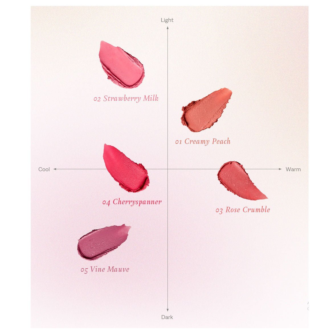 | Option | #01 Creamy Peach, #02 Strawberry Milk, #03 Rose Crumble, #04 Cherryspanner, #05 Vine Mauve |