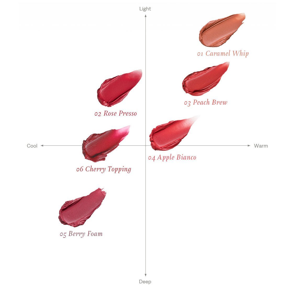 | Option | #01 Caramel Whip, #02 Rose Presso, #03 Peach Brew, #04 Apple Bianco, #05 Berry Foam, #06 Cherry Topping |