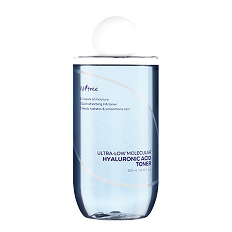 Isntree Ultra-Low Molecular Hyaluronic Acid Toner is a quick-absorbing, vegan Hyaluronic Acid toner infused with deep seawater from Ulleung Island, Korea, that deeply hydrates and soothes skin.