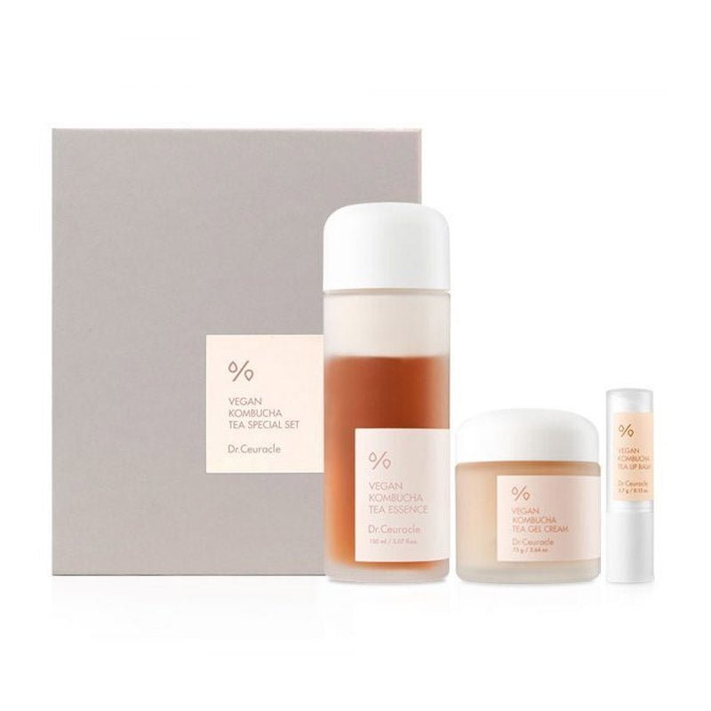 Dr. Ceuracle Vegan Kombucha Tea Special Set helps balance the oil-moisture levels and restore the skin. Also provides nutrition and hydration for the balanced, healthy looking complexion. The moisturizsng lip balm offers intensive lip care to restore healthy lip condition of flaky, dry lips.