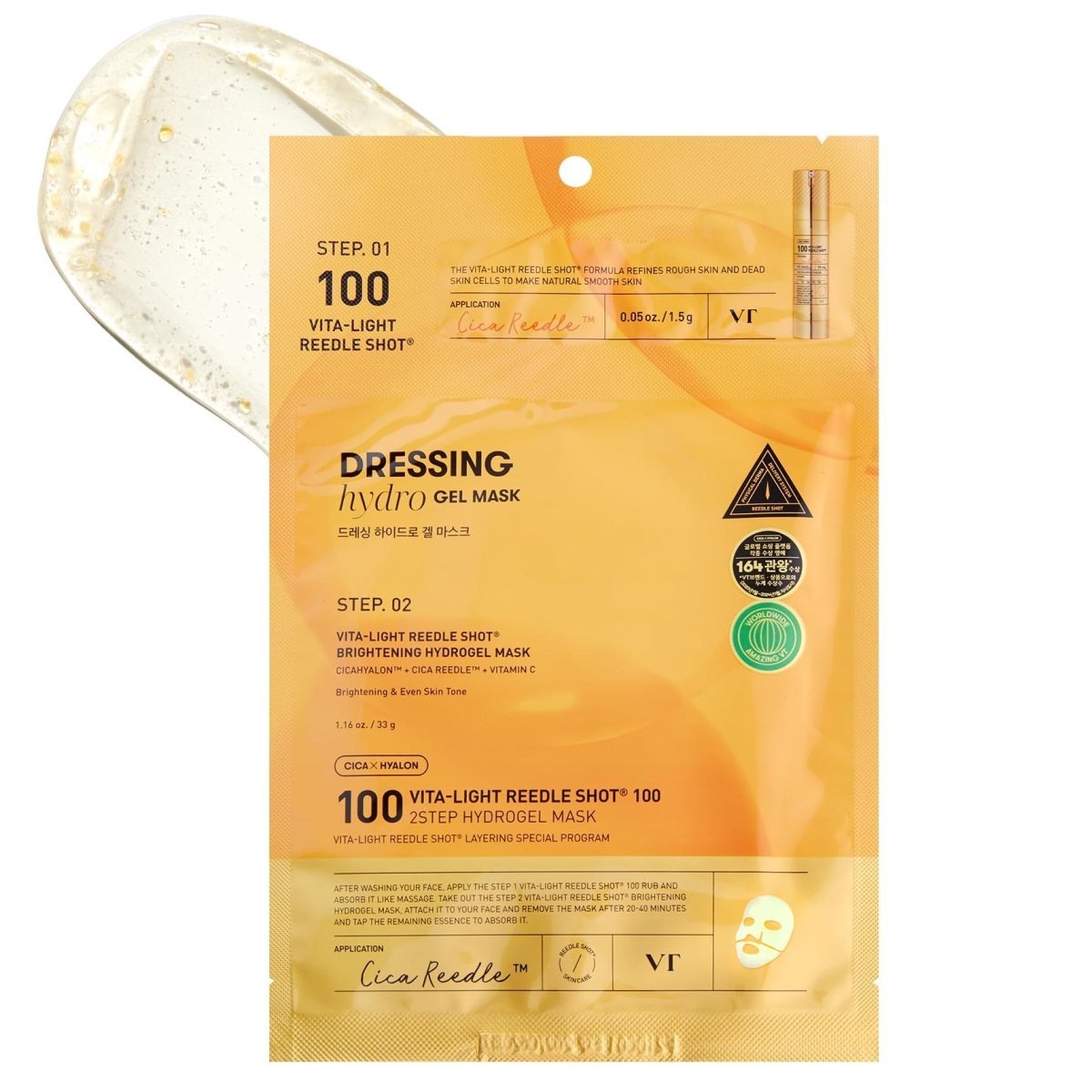 VT Cosmetics Vita-Light Reedle Shot 100 (2-Step Hydrogel Mask) helps moisturize and even out the skin tone.