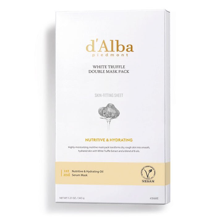 d’Alba White Truffle Double Mask Pack (Nutritive & Hydration) features a nutritive oil and a hydrating serum